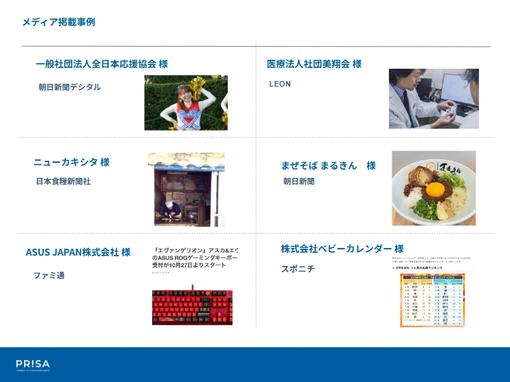 | 顧客の特徴 | PRISAの利用顧客は、小規模事業者から上場企業まで多岐にわたりますが、特に“広報ノウハウに課題を抱える企業”に強く支持されています。月額6万円でTVやWebメディアに露出できるコストパフォーマンスの高さが評価されており、PR初心者でも安心して取り組める伴走型の支援体制が顧客の継続率を高めています。現在も累計630社以上が導入。これから伸びる可能性が大のサービスです伸ばすタイミングに従事するなら今がオススメ! |
