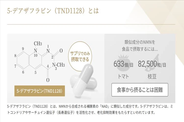 | 市場性 | 健康寿命延伸や老化予防に対する社会的関心は年々高まっており、サプリメント市場も拡大中。「NMNに次ぐ成分」として注目されている5-デアザフラビンは、今後の需要増が期待される成長分野です。 |