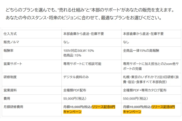 | 加盟金 | 加盟金は5万円(税込)~。正規代理店登録費用として一度だけ発生します。以降は年会費・ロイヤリティ等は不要。オンライン研修や営業支援ツール提供費用も含まれており、追加費用なくスムーズに販売活動へ移行できます。コストを抑えながらも本格的な代理店活動を希望される方に最適です。 |