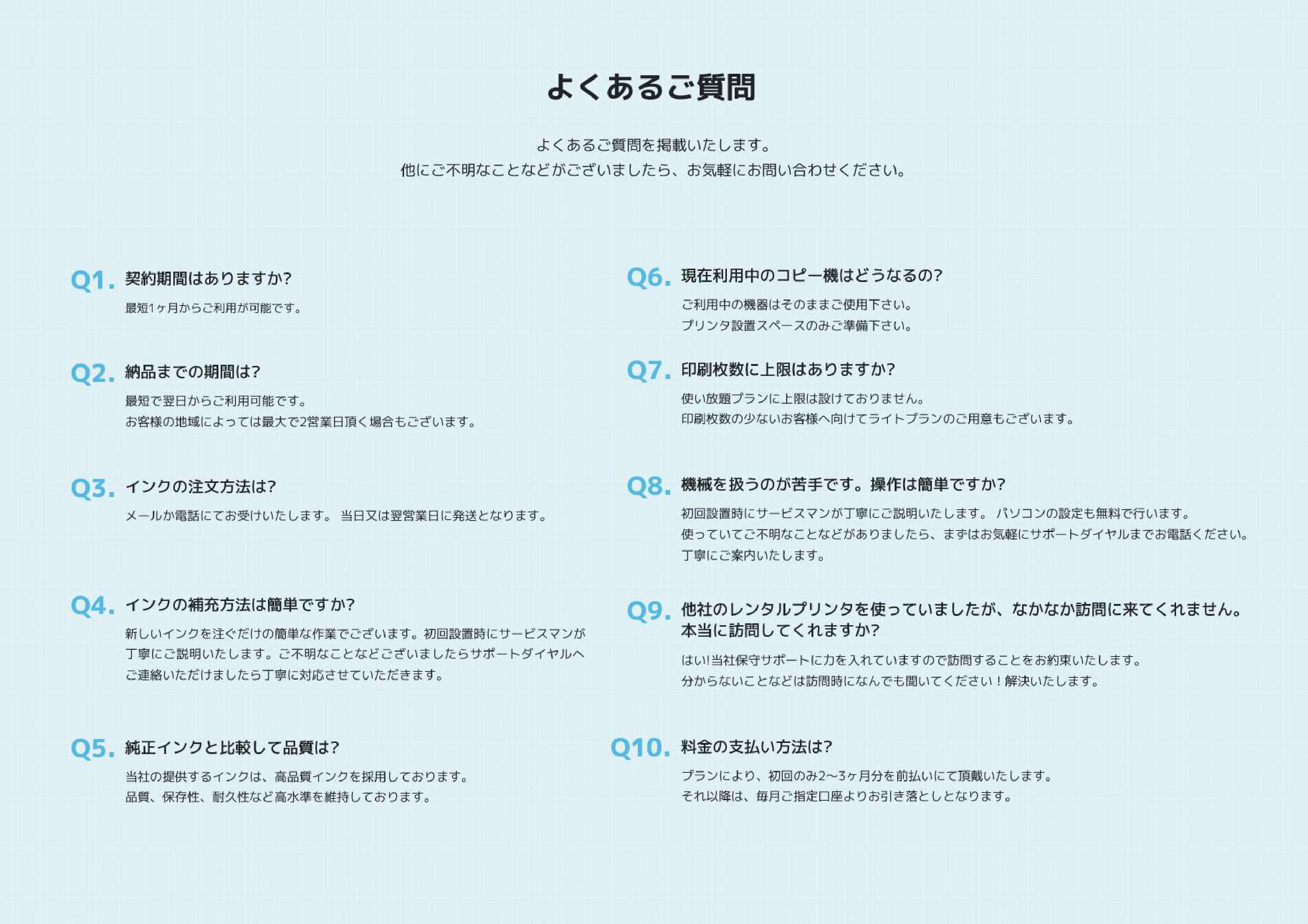 | 事業内容 | プリンター及び複合機のレンタル事業 プリンター及び複合機の販売 WEBコンサルティング・WEBマーケティング業務 WEBサイトの企画・制作・運用 リース・輸出入・製造・加工 取り付け工事及びメンテナンス業務 インクの販売及び卸売り業務 経営一般に関するコンサルティング業務ほか |