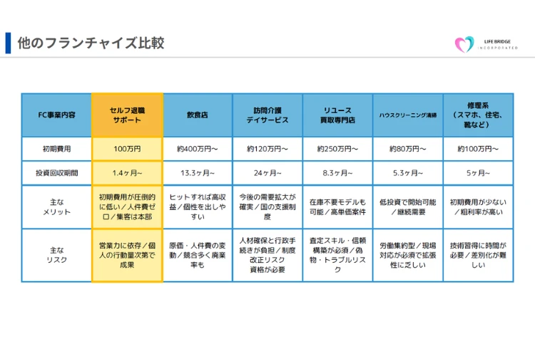加盟店は、営業・面談対応に専念でき、集客や申請書類のサポートは本部が代行。特に、営業経験のある1人法人や個人事業主に適したモデルで、面談から制度説明、契約サポートまでを担います。初期費用は100万円、最短2ヶ月で回収が可能とされ、売上149万〜596万(成約件数5〜20件)といった高収益を狙える設計です。