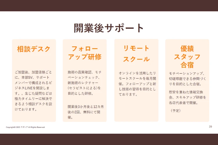 | 強み | ラダシアの強みは、「低初期投資・低ランニングコスト・高リピート・高単価」の4要素を兼ね備えた再現性の高いFCモデルです。本部代表自身が複数のFC加盟・運営経験を持ち、「加盟店側の悩み」を熟知した上で構築された本部体制も信頼感があります。 詳細はお問合せ頂きたいのですが、異業種、初心者でも無理なく参入が出来ている本部の手厚いサポートがあります。ほぼ運営代行のため無理なく新規事業として取り組めます。 |