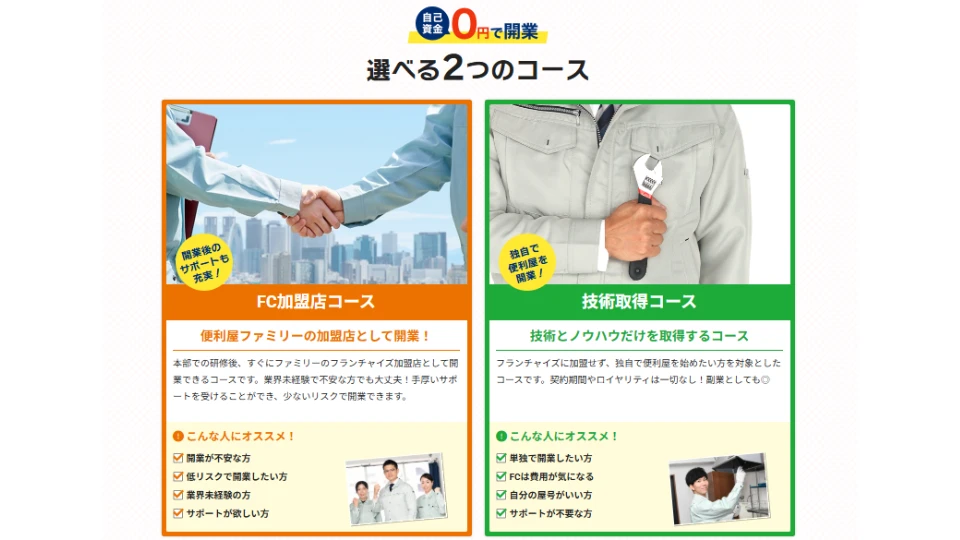 | 市場性 | 高齢化・核家族化が進む現在、生活支援ニーズは年々高まっており、「便利屋」業界は今後も成長が見込まれます。特に地域密着型のサービスは大手が入りにくく、地元密着型の加盟店にとって有利な市場です。実際に全国展開している便利屋ファミリーの拡大スピードが、それを証明しています。 |