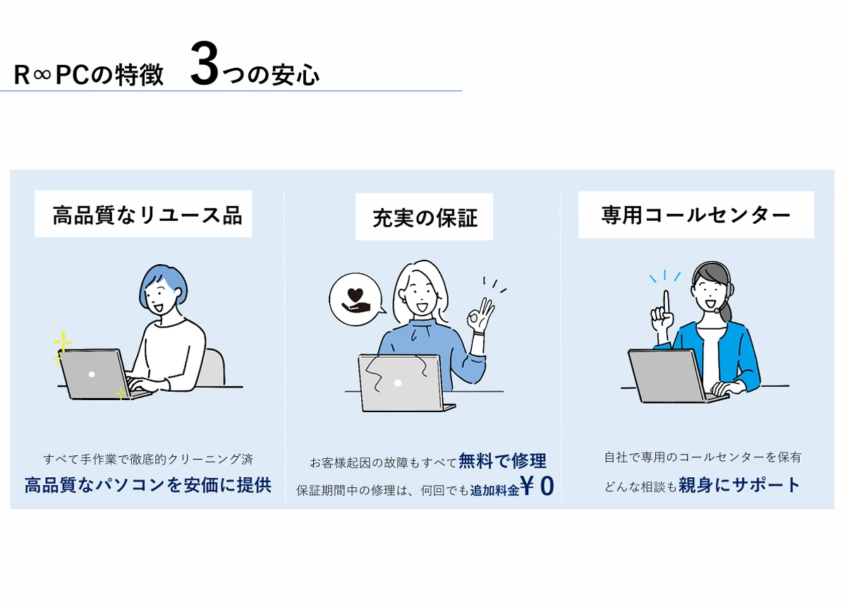 | 強み | 販売後のあらゆるトラブルも、自社コールセンターの日本人スタッフが丁寧に対応するので、安心して販売いただけます。 『中古品は保証面がしっかりしておらず、買うことは二の足を踏んでしまう』 『新品だけでは予算を超えてしまう案件』 『競争力のある商品を取り扱いたい』 『業績が厳しく、コストカットの検討・資産に投資でいないお客様』 上記のような課題をお持ちの法人様・販売店様(古物商許可証必須)に向けてマッチする商品です。 弊社では、「中古という新しい選択肢」をR∞PC(アールピーシー)という形でご提供させていただきます。 |