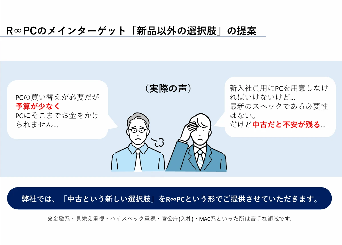 | 顧客の特徴 | ・予算が厳しい法人 ・PCはネットで安い商品を探している法人 ・新入社員用にPCを100台買いたい法人 ・今年10月にサポートが切れるWindows10を利用している法人 法人個人どちらにも対応できるサポート体制を整えています。 |