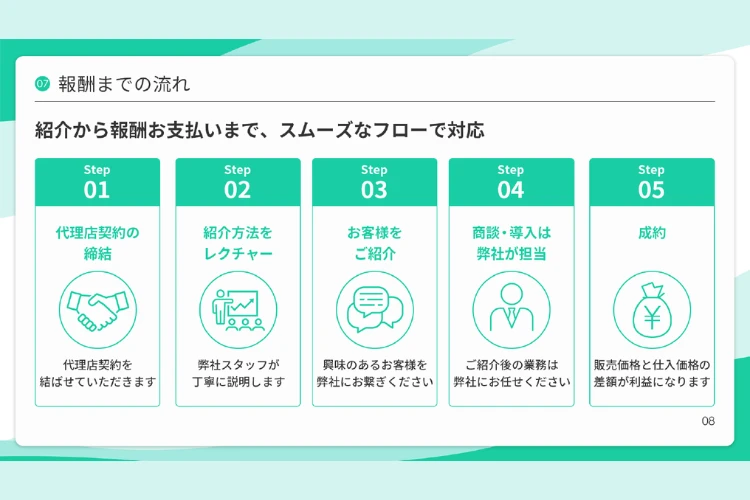 i3Handyの代理店制度は、「紹介型」のシンプルな仕組みです。代理店様が見込み企業をご紹介いただくだけで、商談や導入支援はすべて弊社が担当します。報酬は卸価格と販売価格の差額がそのまま代理店様の利益となるため、営業経験のある法人様であれば高い収益性が期待できます。