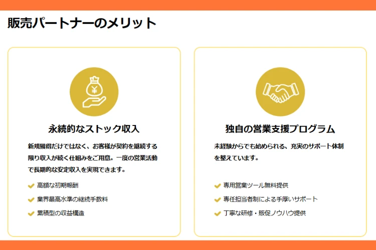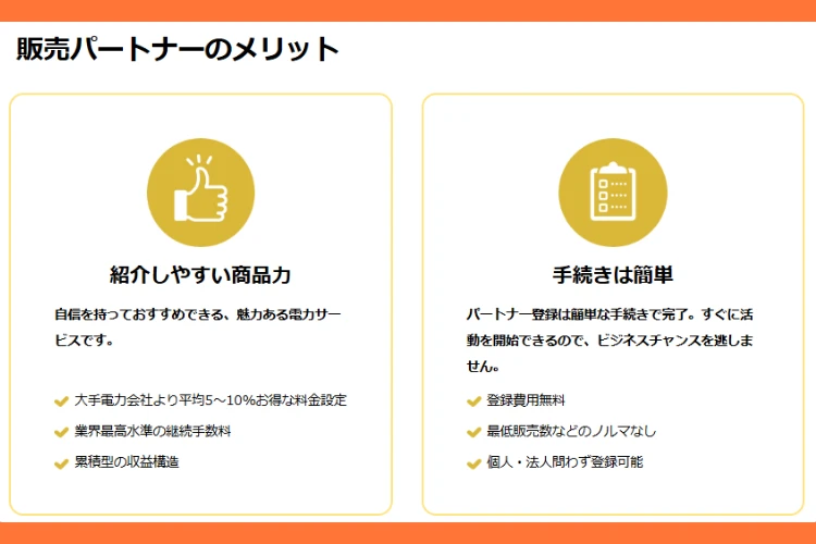 | 強み | ヱビス電力の強みは、単身世帯から法人まで幅広い層に対応可能な点と、代理店にとって収益モデルが明確である点です。在庫リスクや専門知識が不要で、提案後の契約・供給業務はすべて本部が対応するため、営業活動に集中できます。また、ショット型とストック型を選べるインセンティブで、短期的な収益と長期的な積み上げの選べることが大きな魅力です。 |