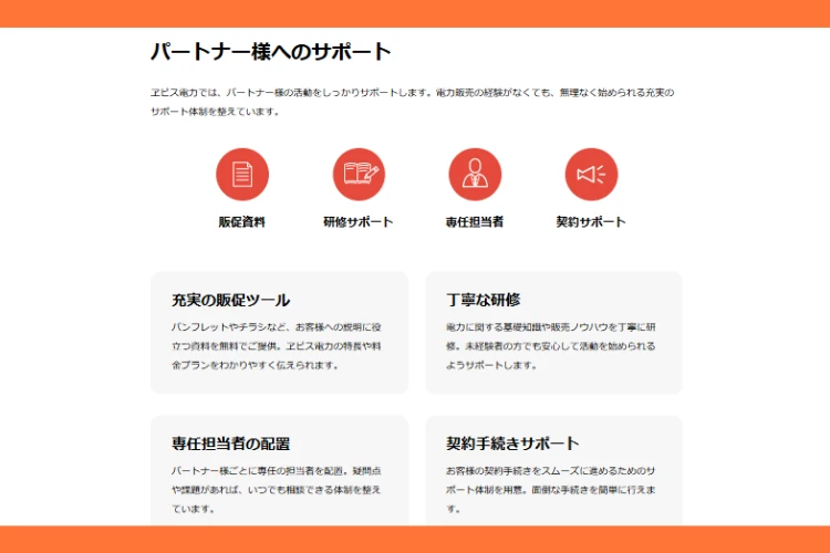 | サポート体制 | 代理店様が安心して参入できるように、商品研修や営業資料、トークスクリプトなどを提供します。契約後の与信審査や電力供給手続きは本部が対応し、代理店は営業に専念可能。さらに、導入事例や提案ノウハウの共有を通じて、未経験の事業者様でも成果を出せる体制を整えています。 |