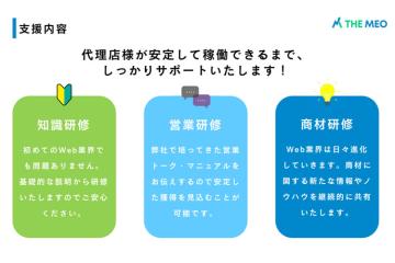 | サポート体制 | 未経験から始めるWebビジネスのチャンス!営業ツールとマニュアルで成功を支援します! 基礎から応用までの知識研修を提供し、営業トーク・マニュアルをはじめ、最新の商材情報やノウハウの共有を通じて、代理店様が安定して稼働できるよう全面的にサポートします。 Web業界未経験者でも安心してビジネスをスタートでき、MEO業界の知識とともに、営業スキルの向上をも期待できます。 |