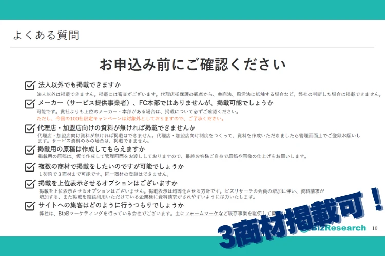 | 顧客の特徴 | ビズリサーチの顧客は、代理店やフランチャイズ加盟店をすでに募集している企業様、またはこれから本格的に募集を始めようとしている企業様です。さらに、紹介店制度やトスアップパートナー制度を構築したい企業様、業務委託先を探している企業様も多く利用しています。従来の媒体に多い「個人や副業希望者」は対象外で、法人または個人事業主に限定しているため、商談に直結しやすいのが大きな特長です。代理店として提案する際も、「募集に課題を感じている本部」にアプローチできるため、導入検討につながりやすく、営業効率が高い市場です。 |