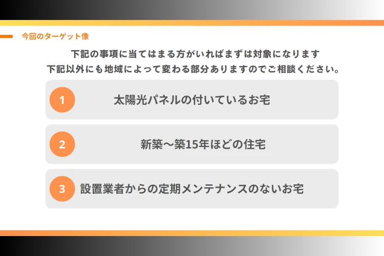 | 顧客の特徴 | メインターゲットは、新築〜築15年程度の戸建て住宅で太陽光を設置している家庭。設置業者による定期メンテナンスが行われていないケースが多く、未対応の家庭に対して「義務化された点検をお知らせする」だけでアポイントが取れる傾向にあります。火災・発電低下・売電ロスなど、生活直結のリスクがあるため、提案を受け入れやすい市場です。 |