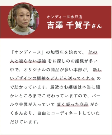 弊社のビジネスモデルは、問屋を介さずメーカーから 直接仕入れ をおこなうため、生産者には消費者のニーズを、消費者には高品質な振袖をリーズナブルに届けられるという、 三方良しのビジネスモデルが特長です。