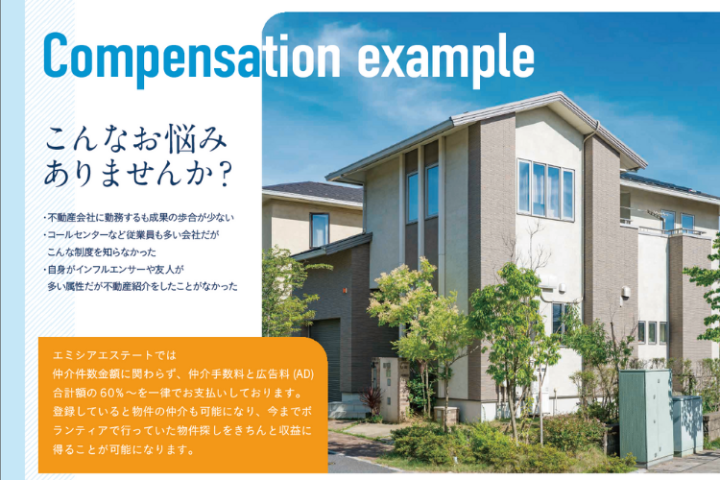エミシアエステートの代理店制度は、完全成果報酬型の紹介ビジネスモデルです。