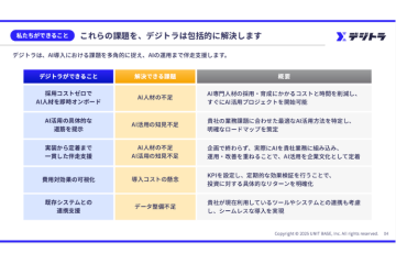 『デジトラ』は、AI導入を検討する企業に対し、専属のAIチーム(プランナー/AIコンサルタント/実装エンジニア)が伴走支援する月額制のAI導入支援サービス。
