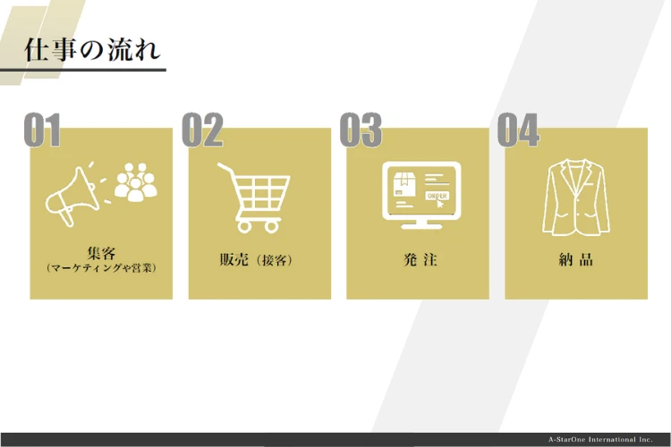 | 強み | A-StarOneは、メーカー直営・開業支援・生産管理・FC本部を一体化した、業界でも稀有な「オールインワン体制」を構築しています。自社開発のスマート生産システム「SmaTech」により、AI検品・3D採寸・オンライン発注を統合。これにより、最短7営業日納品と高品質な仕上がりを両立しています。 また、国内外で多数の導入実績を誇り、著名人や上場企業などにも選ばれるブランドとして高い信頼性と認知度を確立。全国420拠点・開業実績No.1という実績データが、ビジネスモデルの安定性と再現性を裏付けています。 営業活動や印象戦略に活用できる提案資料・販売ツールが充実しており、法人営業やコンサルティング業などへの導入提案をスムーズに進められます。 スーツを単なる販売商材としてではなく、「営業成果を高めるツール」として位置づけることができる点が、他のフランチャイズにはない強みです。 本部によるサポートも整っており、未経験からでも法人向けビジネスを展開しやすい仕組みが構築されています。 |