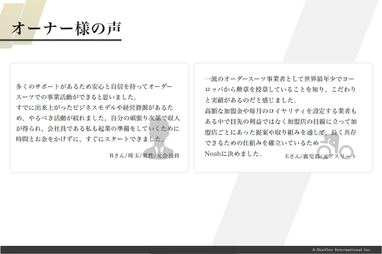 オーダースーツNoahは、A-StarOne Internationalが展開するオーダースーツ開業支援事業。全国420拠点・業界No.1の実績を誇り、法人・個人事業主が自社ブランドとしてオーダースーツ事業を運営できる仕組みを提供しています。