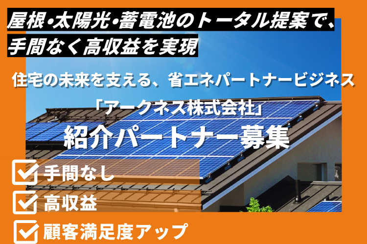 施工はアークネス株式会社が責任をもって実施し、協力会社は営業負担を最小限に抑えつつ報酬を得る成果報酬型のモデルとなります。