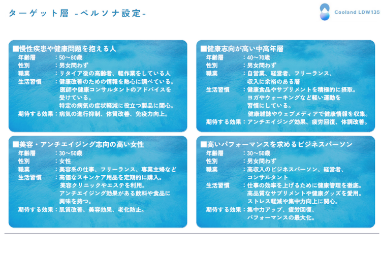 | 顧客の特徴 | COOLAND LDW135の主な顧客は、健康意識・美容意識が高い層や、日常的に体調管理を行う層です。中でも、健康食品・サプリを習慣にしている中高年、良質な水を求める美容関係の利用者、コンディション維持を重視するアスリート層から継続的なニーズが見られます。また、PFAS不検出や天然由来という安全性は、高齢者や医療・施術系の顧客にも受け入れられやすく、サロンや整体院での店頭販売にも適しています。飲みやすい中硬水のため提案のハードルが低く、既存の健康商品と併せて案内しやすい点も特徴です。継続摂取の価値が理解されやすく、リピートが期待できる顧客層が多いことが、販売側にとって扱いやすいポイントとなっています。 |