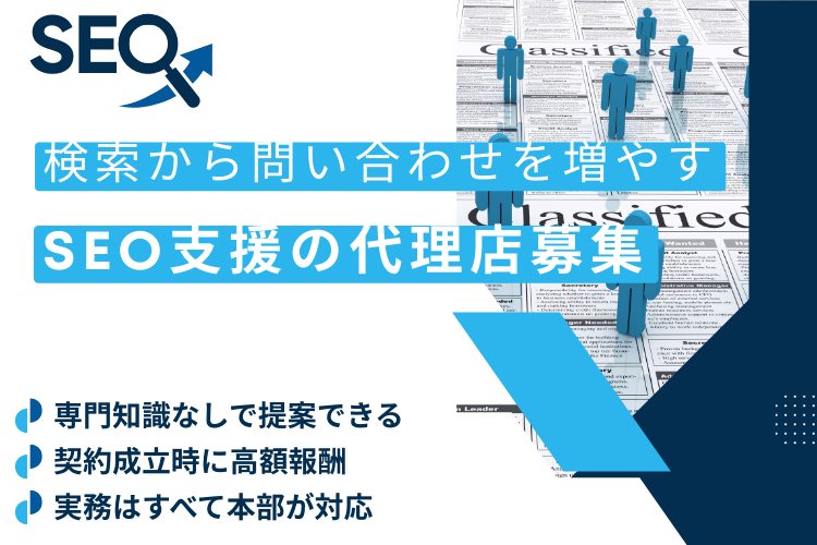 代理店は、企業への提案・紹介を中心に活動し、実務部分は弊社が担当するため、SEOの高度な知識は不要です。既存顧客基盤のある制作会社、広告会社、営業代行会社、コンサルティング会社にとっては、新しい収益ラインとして非常に親和性が高い商材です。また、初回の導入支援に伴うフロー収益と、月額コンサルによるストック収益の両方を獲得できるため、長期的な収益モデルを構築できます。