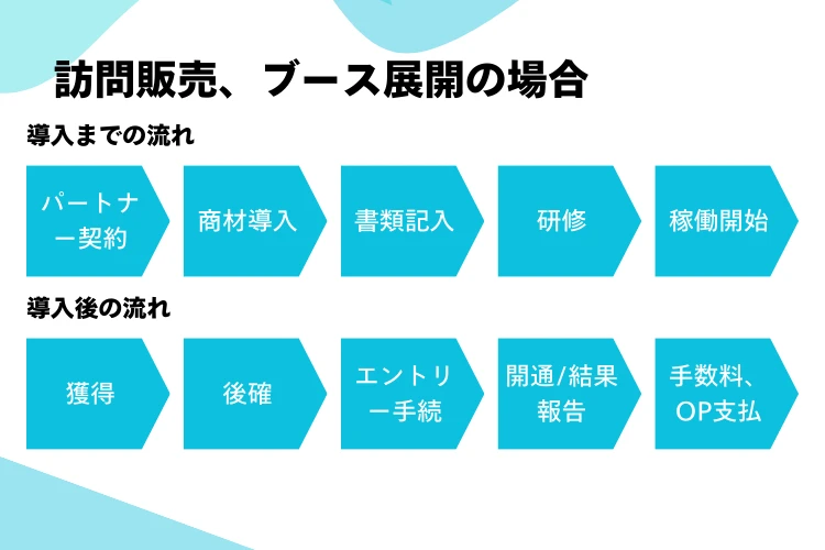 営業手法は、テレマーケティング、訪問販売、催事・ブース展開、アライアンス紹介など複数に対応。自社の得意な手法を選択できるため、無理な業務拡張は不要です。後確や上位店対応が必要な場面では本部が取りまとめを行い、代理店は営業活動に集中できます。