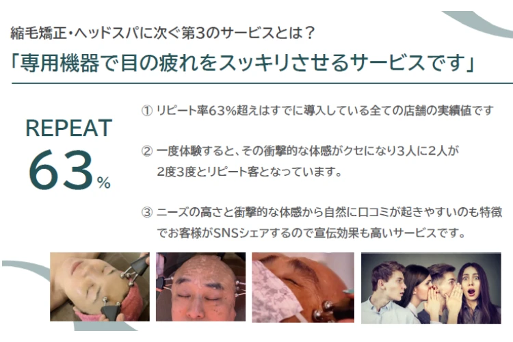 また、理美容向けと同じく「10分で体感できる強い効果」があるため、従業員の利用率・満足度が高くなりやすく、「健康診断のように義務的に受けるもの」ではなく「自ら受けたくなるサービス」として定着させることができます。利用回数に応じて月額モデルやチケット制を設計できるため、企業・代理店双方にとって継続的なビジネスに発展させやすいモデルです。