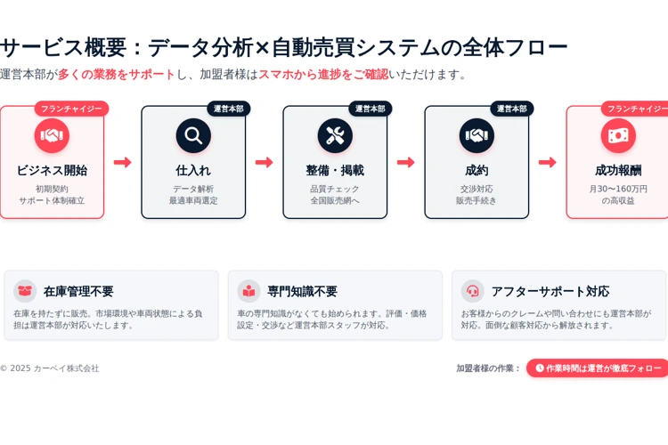 | 強み | Carbeyの最大の強みは、「在庫不要」「データ分析」「本部代行」の三位一体モデルにあります。加盟者はスマホで進捗を確認するだけで、仕入れ・整備・商談・納車・アフター対応までを本部が代行。専門知識や人員を抱えずに中古車販売事業を展開できます。さらに、1台あたり30〜160万円という高水準の粗利を実現できる点も魅力です。創業メンバーは、中古車業界で数億円規模の実績を持つ代表、マーケティングや資金調達に精通する経営陣で構成されており、確かなノウハウと実績に基づいたサポートが提供されます。「儲かる車屋を、みんなの手に」という理念のもと、持続可能で革新的なビジネスモデルを展開しています。 |