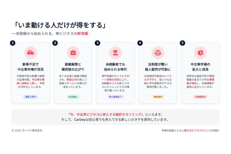| 市場性 | 中古車市場は新車不足や半導体不足、環境意識の高まりを背景に成長を続けています。新車の供給制限により、中古車価格は上昇傾向にあり、今後も需要は拡大する見込みです。加えて、カーシェアやリユース需要の高まりにより、中古車の流通は社会的にも必須のインフラとして注目されています。Carbeyは、この成長市場において、在庫リスクを抱えずに参入できる稀有なフランチャイズモデルを提供し、法人や個人事業主にとって将来性の高い新規事業機会を実現します。 |