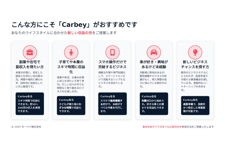 このようにCarbeyは、異業種からの参入でも知識や経験を必要とせず、法人・個人事業主が安心して始められる新しいフランチャイズモデルです。既存事業と両立しながら、成長市場で短期回収を目指せる点が大きな魅力となっています。
