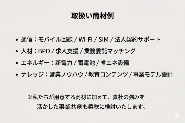 | 市場性 | DX推進・人手不足・省エネ志向など、企業課題の多様化が進む今、複数領域を横断するソリューション需要は急増中。 通信・人材・エネルギーといった社会インフラ型商材は安定性が高く、景気変動にも強い市場です。 弊社のようにToB・ToC双方に対応できる代理制度は希少で、長期的に拡張可能なビジネスモデルです。 |