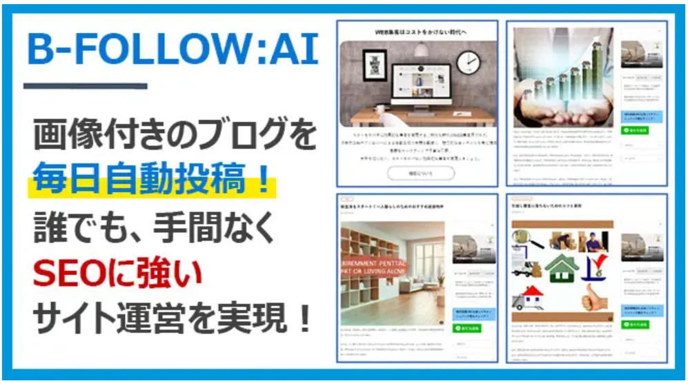 | 強み | AIによる高品質なブログ記事の自動生成・投稿機能、低コストでの運用、そして高い顧客満足度と継続率が「B-FOLLOW:AI」の強みです。 |