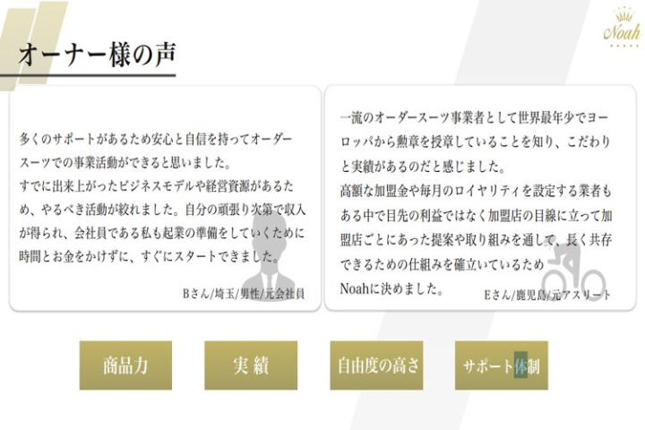 「オーダースーツ Noah 」のフランチャイズ加盟募集 成功事例