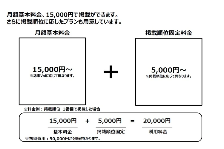 | サポート体制 | 月間400万PV超のメディア群を保有し、SEO対策にも強い記事型広告。Google検索で上位表示される確率が高く、掲載企業の公式サイトへの流入増加、売上貢献が期待できます。記事作成・校正は専門チームが担当するため、パートナー様は営業に集中可能です。 |