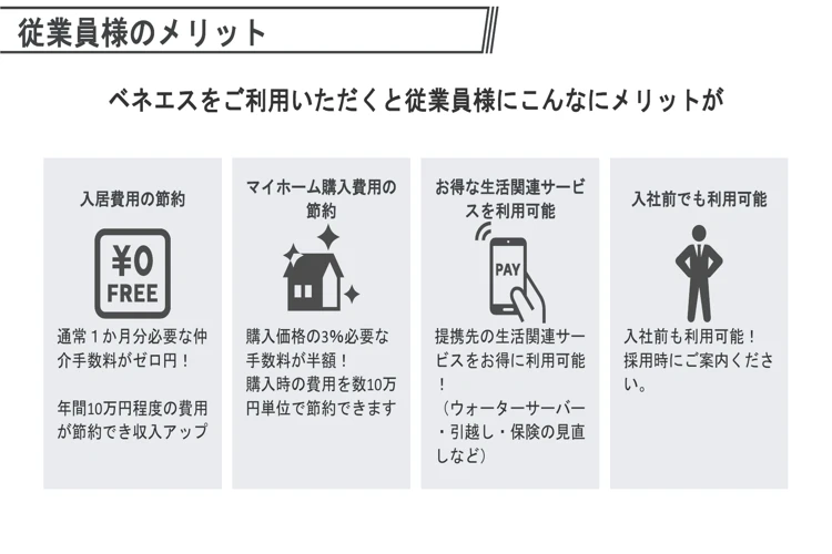 ベネエスは、中小企業で働く方の所得増加、中小企業の採用強化及び人材定着を目指す福利厚生型賃貸サービスです。