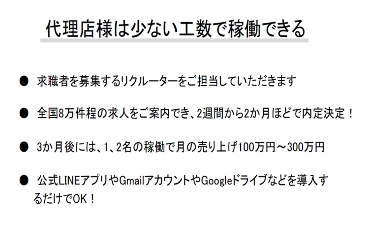 | 強み | スマホ1台で運営可能(LINE・Gmail・Google活用) 面談・求人紹介は提携先が対応、工数極小 全国8万件以上の求人情報と連携 1〜2名稼働で月商300万円事例あり 初期費用・加盟金不要、手軽に本業化可能 |