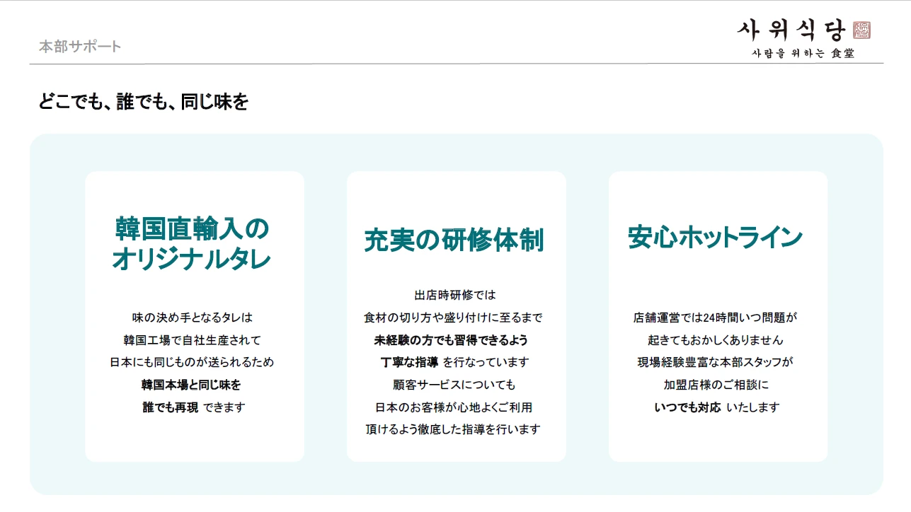 | サポート体制 | 出店前:商圏調査、内装・厨房設計、販促設計 開業時:直営店でのオペレーション研修(現地滞在含む)、調理指導、マニュアル支給 開業後:販促アドバイス、24時間対応の相談ホットライン、本部SNS支援 飲食未経験の法人でも安心して参入できるよう、運営ノウハウは完全にパッケージ化されており、必要な食材や調味料は本部から供給される仕組み。人材教育までを支援。 |