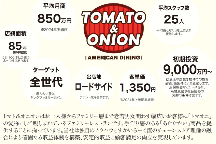 国内唯一のファミリーレストランFC 「トマト&オニオン」FC加盟店募集(すかいらーくグループで安定収益×高リピート率) 企業情報