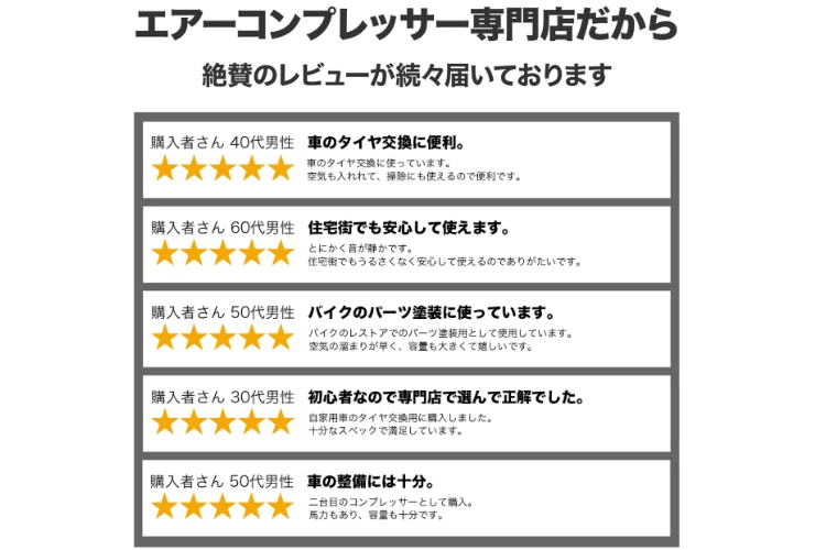 | 顧客の特徴 | コンプレッサーは、製造業・整備工場・飲食業・建設現場・農業施設など、空気圧機器を活用するあらゆる業種で必要とされています。特に「古い機種の買い替えニーズ」「電気代の削減提案」「静音・高性能タイプへの切替」など、課題を抱えた顧客が明確なため、営業先の反応も良好です。さらに、地方中小企業や個人工場などは「誰に相談してよいかわからない」潜在ニーズ層が多く、提案営業の切り口が豊富で顧客獲得しやすい点も特徴です。 |