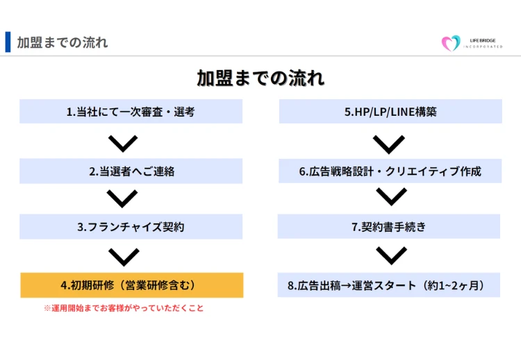 | サポート体制 | ライフブリッジ本部は、加盟前から開業後まで切れ目のないサポートを提供します。営業開始前には制度理解を深める研修やロープレを実施し、開業後は広告運用・集客・LINE対応・制度相談まで一括で支援。さらに、提携士業との連携により、申請関連のサポートも充実しています。営業に集中しやすい環境が整っており、未経験からでも安心して取り組めるフランチャイズモデルです。 |