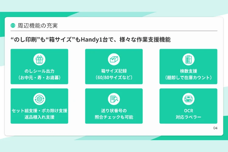 | 強み | i3Handyは、学研グループの物流子会社である株式会社学研ロジスティクスが、現場の実務から得たノウハウを活かして開発した商材です。アプリの提供にとどまらず、導入検証・ハード貸与・教育支援・サポート保守までワンストップで対応。特に現場オペレーションを熟知しているからこそ提供できる“現場目線”のツールは、導入企業から高い評価を受けています。 |