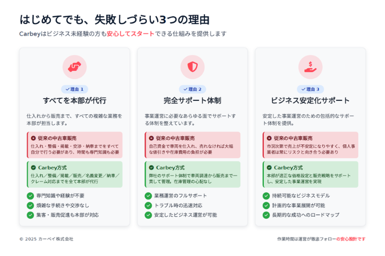 サポート体制 | Carbeyでは、未経験の法人・個人事業主でも安心して参入できるよう、徹底したサポート体制を整えています。開業時には事業説明や法令対応のレクチャー、古物営業法の取得サポートを行い、立ち上げをスムーズに支援。本部が仕入れ・整備・価格設定・商談・納車・アフター対応を代行するため、専門知識がなくても運営可能です。また、専任担当者による継続的なコンサルティングや定期フォローアップを実施。市場動向に基づいた販売戦略や収益最大化のアドバイスも受けられる体制で、加盟後も長期的に安定経営を支援します |