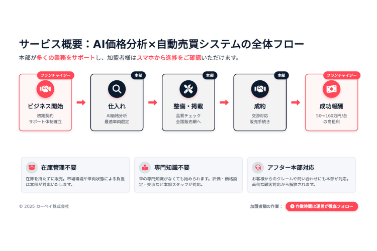 AI自動売買システムで始める中古車FCビジネス「Carbey」フランチャイズ加盟店募集 の ビジネスモデル
