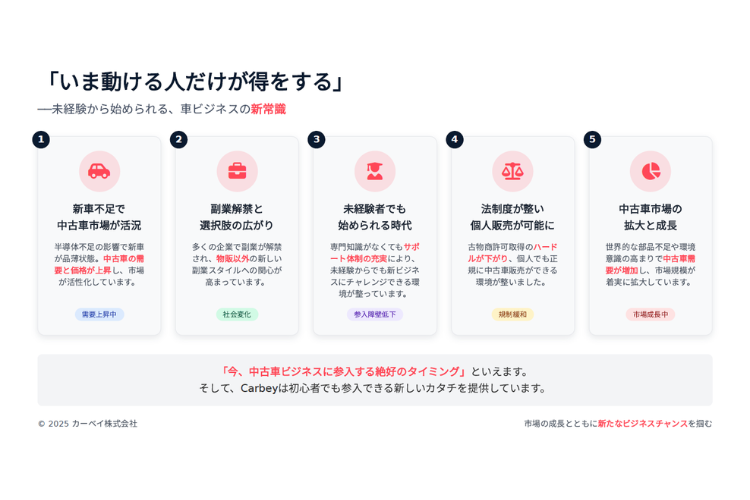 市場性 | 中古車市場は新車不足や半導体不足、環境意識の高まりを背景に成長を続けています。新車の供給制限により、中古車価格は上昇傾向にあり、今後も需要は拡大する見込みです。加えて、カーシェアやリユース需要の高まりにより、中古車の流通は社会的にも必須のインフラとして注目されています。Carbeyは、この成長市場において、在庫リスクを抱えずに参入できる稀有なフランチャイズモデルを提供し、法人や個人事業主にとって将来性の高い新規事業機会を実現します。 |