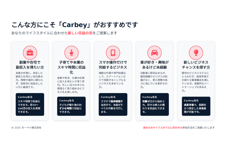 このようにCarbeyは、異業種からの参入でも知識や経験を必要とせず、法人・個人事業主が安心して始められる新しいフランチャイズモデルです。既存事業と両立しながら、成長市場で短期回収を目指せる点が大きな魅力となっています。