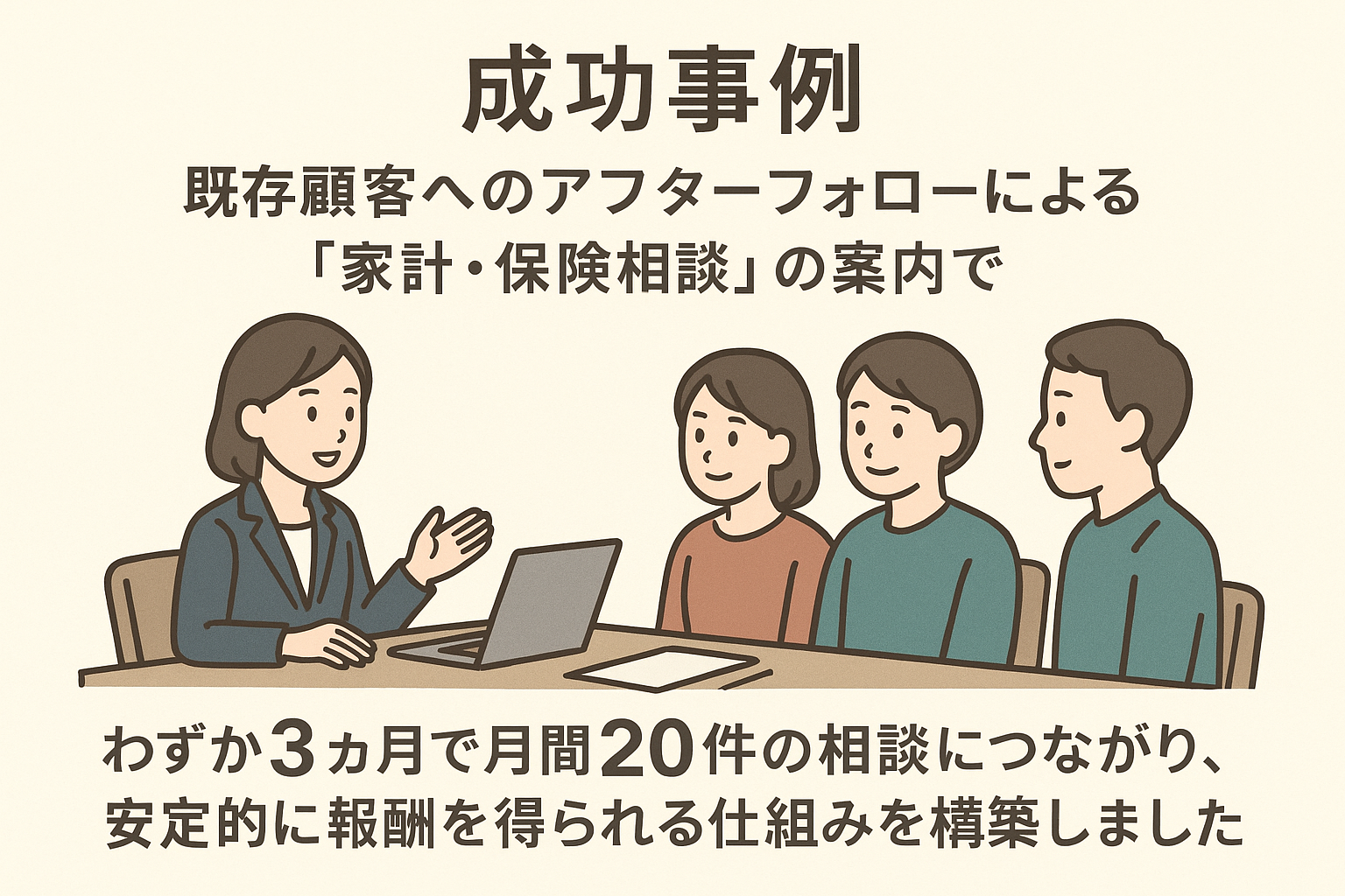 ある広告代理店は、既存顧客へのアフターフォローの一環として「家計・保険相談」を案内したところ、わずか3カ月で月間20件の相談につながり、安定的に報酬を得られる仕組みを構築しました。