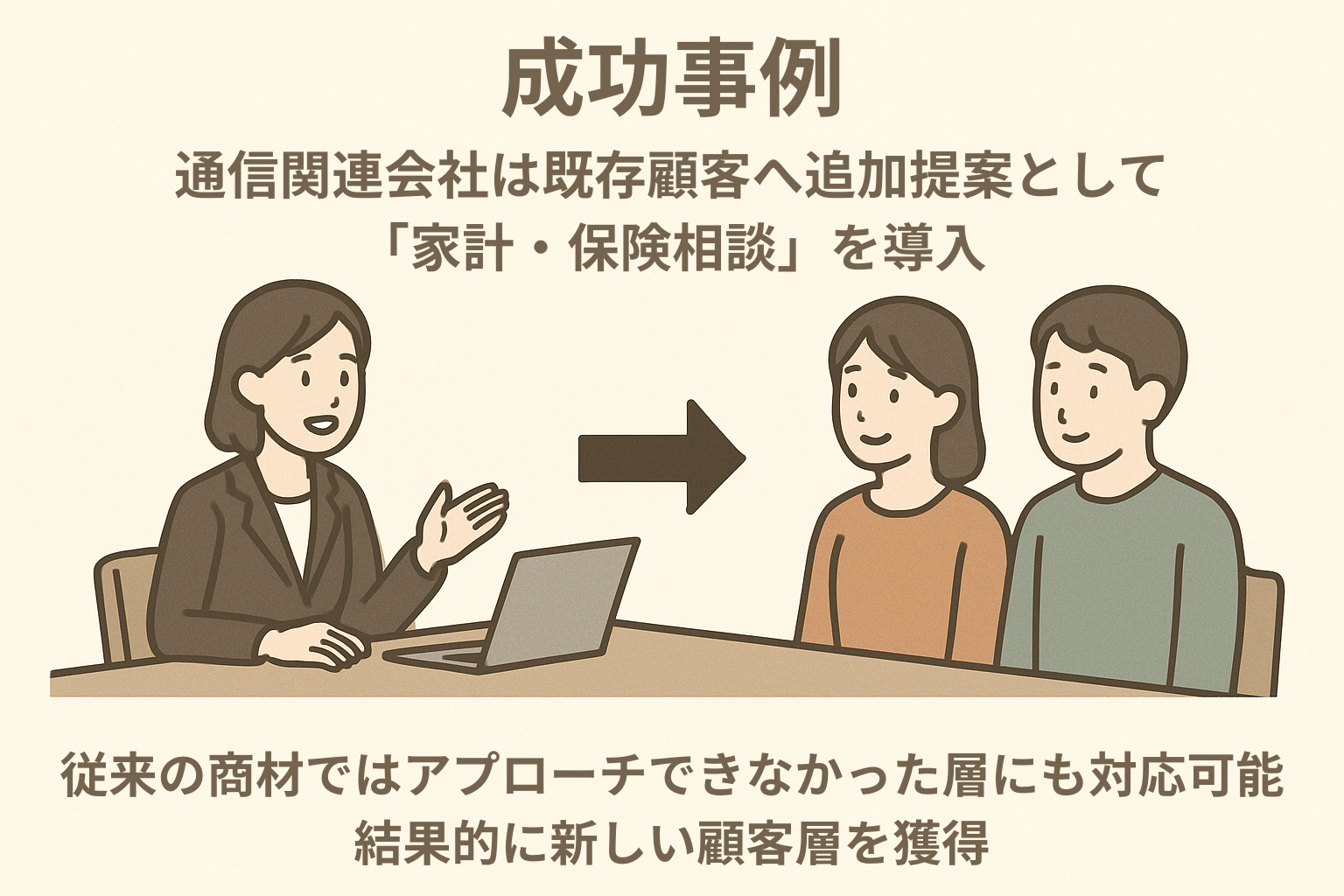 また、別の通信関連会社は既存顧客への追加提案として「家計・保険相談」を導入。従来の商材ではアプローチできなかった層にも案内が可能となり、結果的に新しい顧客層を獲得。既存事業の売上増加に直結すると同時に、新たな収益源を生み出すことに成功しました。