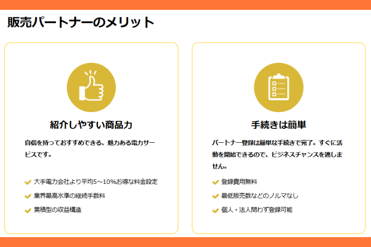 強み | ヱビス電力の強みは、単身世帯から法人まで幅広い層に対応可能な点と、代理店にとって収益モデルが明確である点です。在庫リスクや専門知識が不要で、提案後の契約・供給業務はすべて本部が対応するため、営業活動に集中できます。また、ショット型とストック型を選べるインセンティブで、短期的な収益と長期的な積み上げの選べることが大きな魅力です。 |
