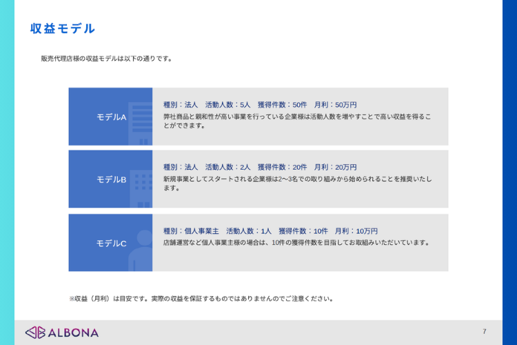 サポート体制 | 商材理解・導入説明用のオンライン研修 販売資料・営業トークスクリプト・導入事例の共有 商談同席・デモサポート対応 取引開始後も定期フォローあり(販売状況・案件相談対応) 各代理店の販売体制に合わせたカスタマイズ支援可 ALBONAでは、未経験の方でもスムーズに立ち上げができるよう、営業資料やFAQなどを全て提供します。オンライン商談での同行支援も可能です。 |