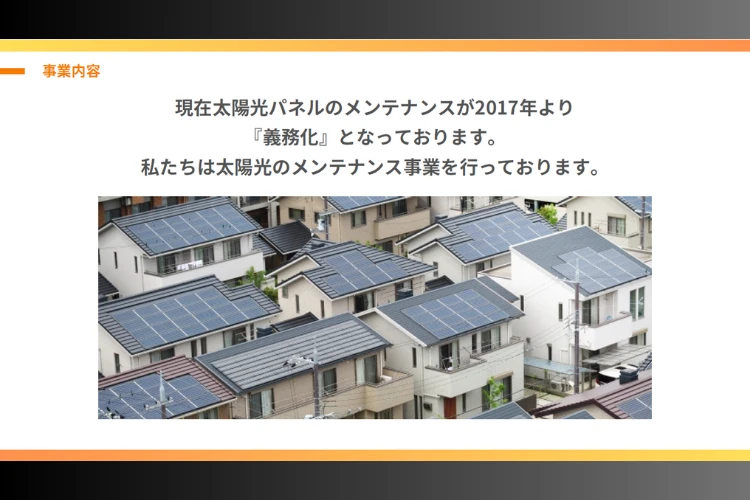 | 市場性 | 太陽光パネルの普及と共に、メンテナンスの需要も年々増加中。2017年の法改正により、メンテナンスが義務化されたことで、既存設置家庭への点検提案が非常にしやすい状況にあります。再エネ・脱炭素の流れとも相まって、市場規模は今後も右肩上がりが見込まれ、地域密着型の営業展開とも親和性が高い分野です。 |