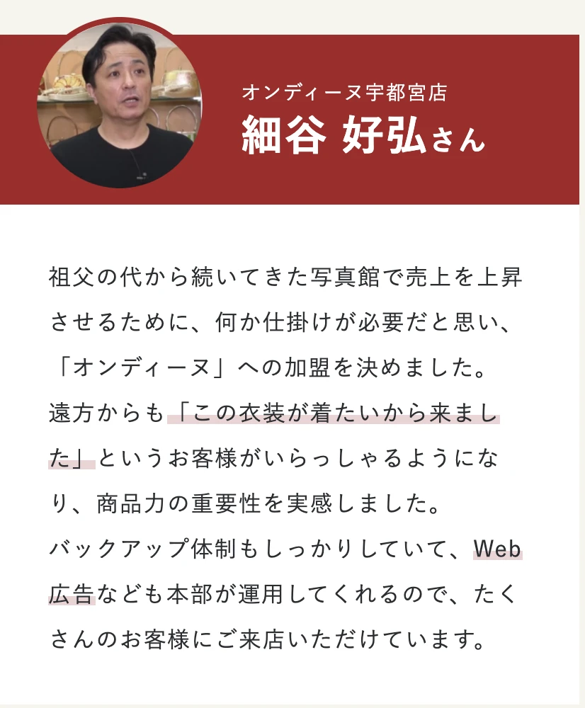 | 顧客の特徴 | 写真館、美容室、結婚式場などの商業スペースの一部を使って開業可能です。 |