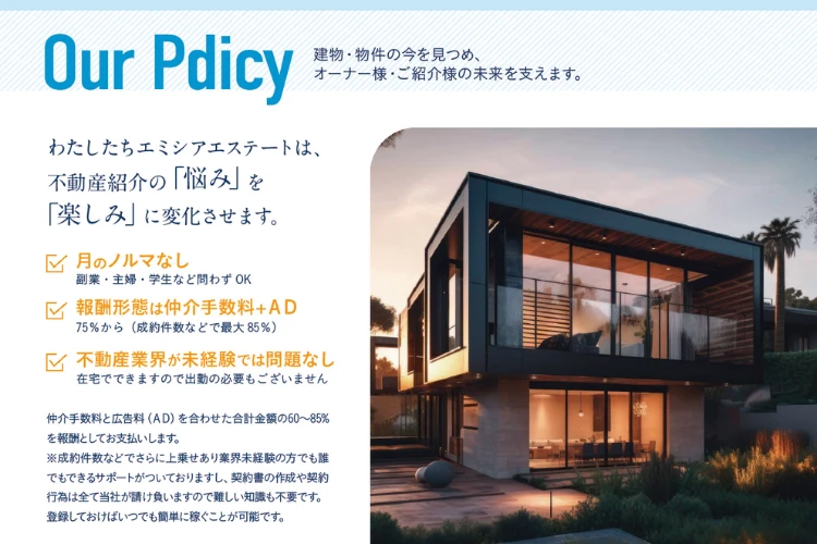 「エミシアエステート紹介エージェント」は、株式会社エミシアエステートが展開する不動産紹介パートナープログラムです。
